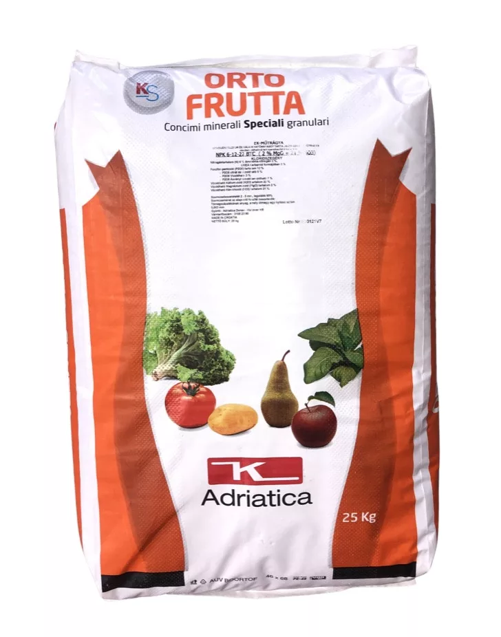 Az Adriatica 6-12-22 Orto Frutta egy prémium minőségű, tiszta kálium-szulfát (SOP) alapú, kloridmentes komplex NPK műtrágya, amelyet kifejezetten a magas minőségi elvárásokkal rendelkező kertészeti kultúrák számára fejlesztettek.